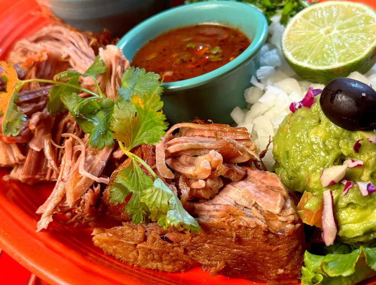 Slow-roasted pork that melts in your mouth, served with soft, hot homemade tortillas. Complemented by creamy guacamole, vibrant salsa, and homemade frijoles de la olla. A traditional Mexican delight.